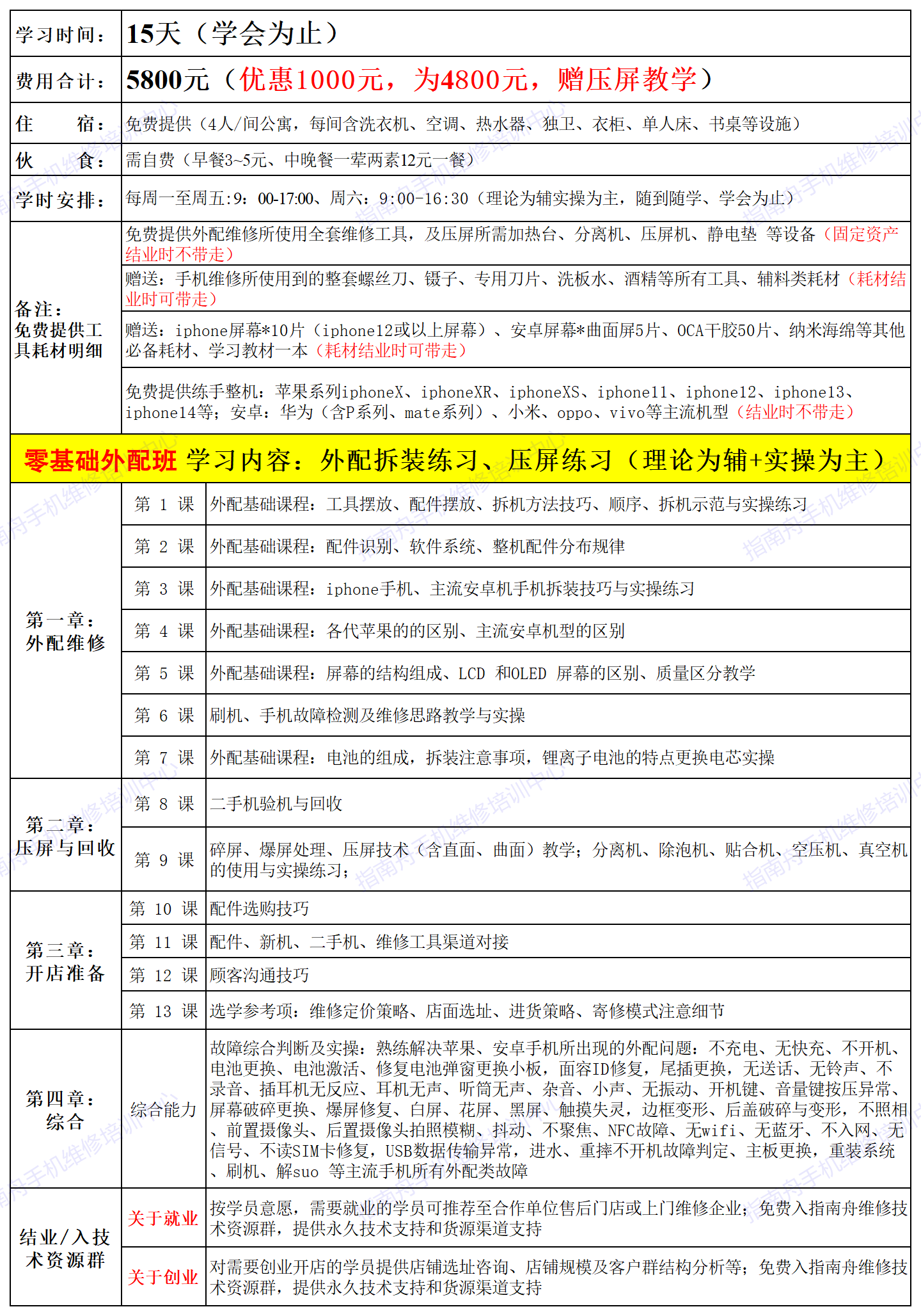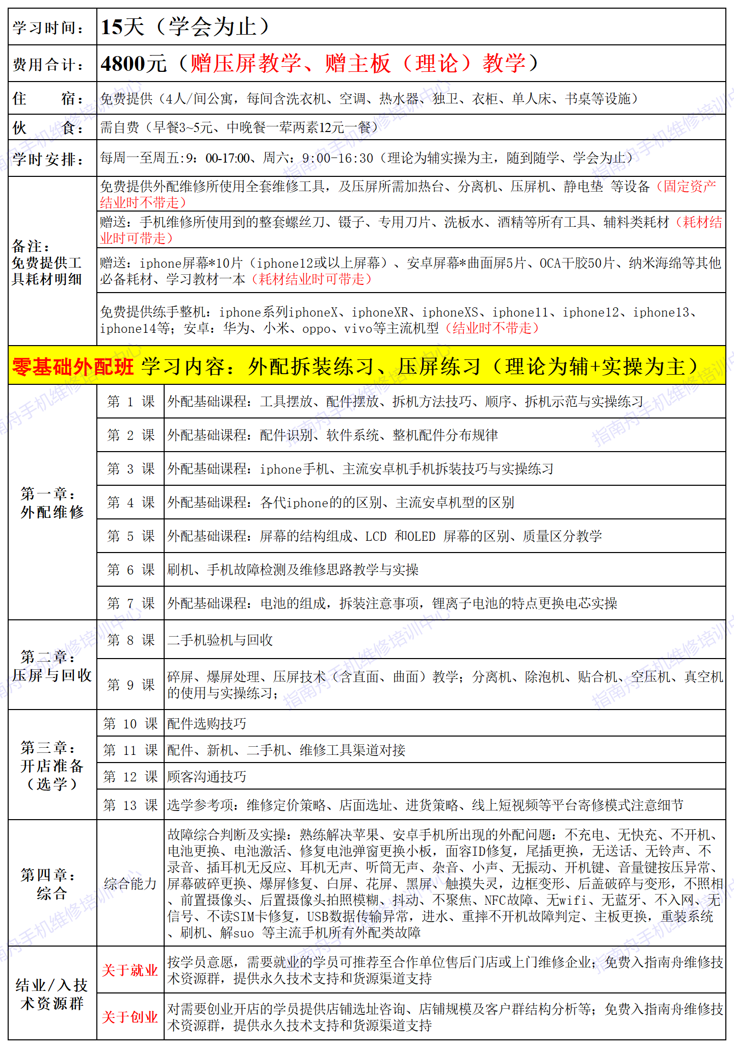 针对对手机维修感兴趣的0基础人员或已有相关经验需要通过学习进行外配维修技术提升的人员,小班化教学。技术达到要求后可推荐至合作企业就业;从事O2O上门维修或品牌(华为、苹果)售后驻店维修。