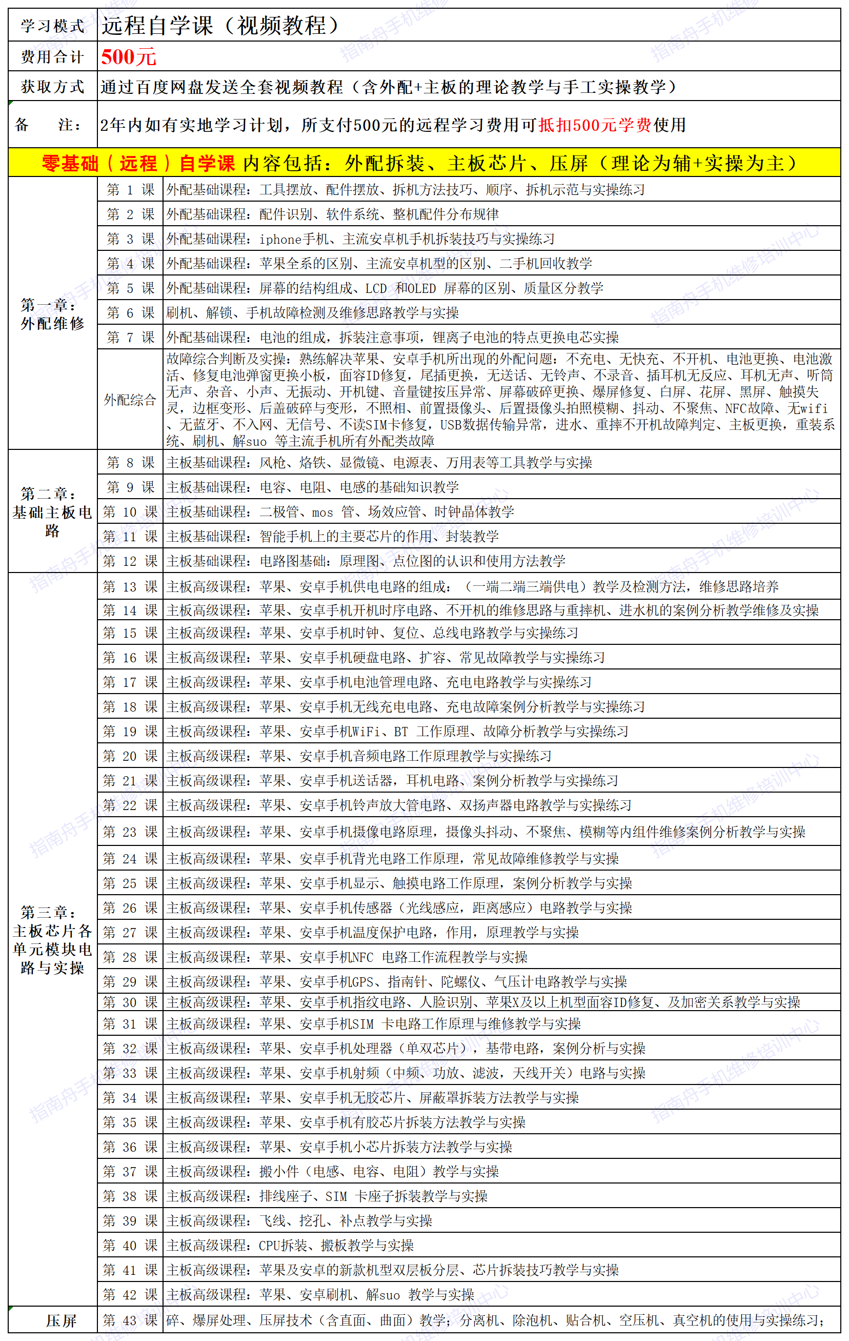 适合对手机维修感兴趣、或已在从事手机维修行业、或计划做进一步技术提升;但又暂时无法抽出时间到实地学习的学员,可进行远程学习,课程逐月更新,与现场全能班同步课程录制视频